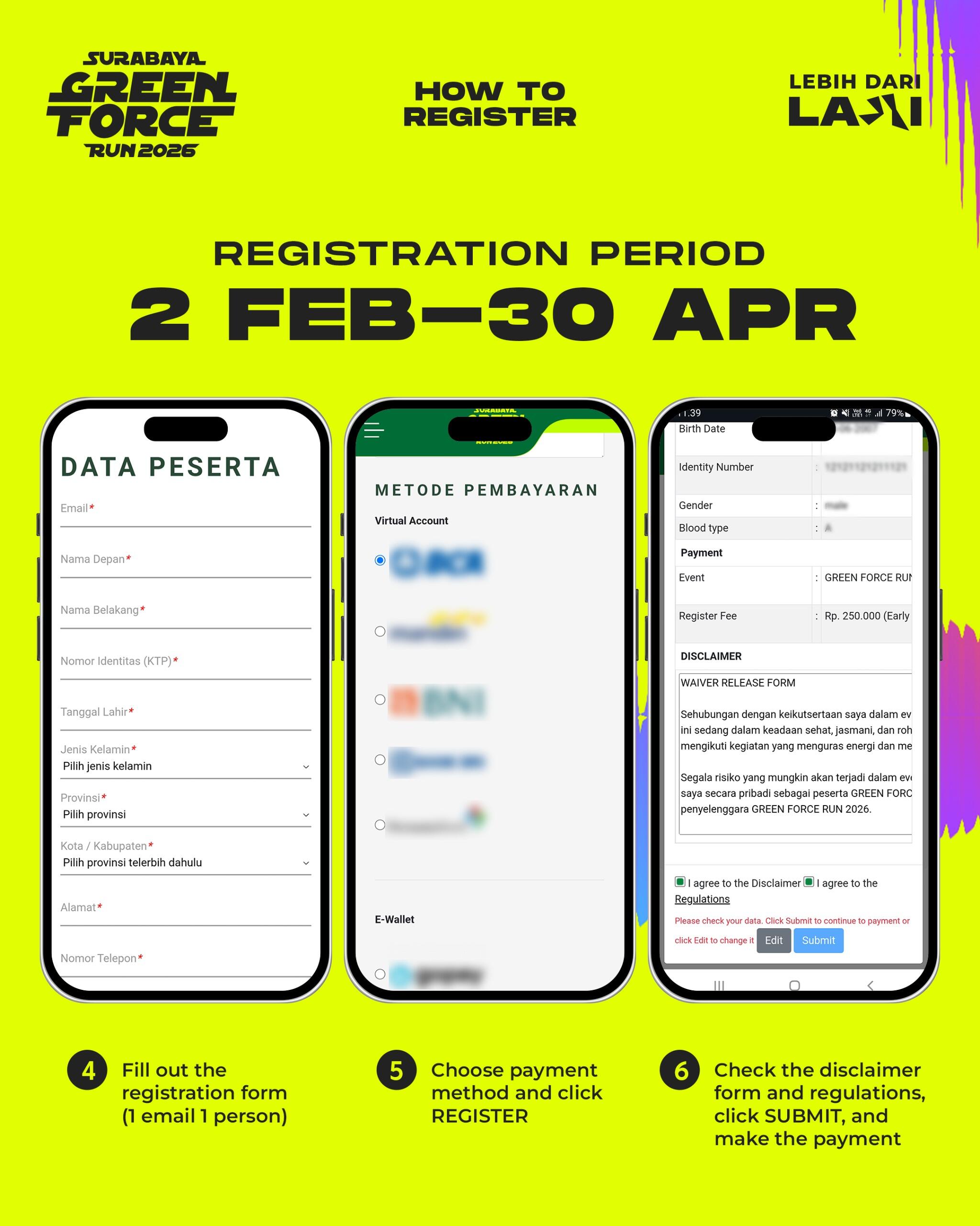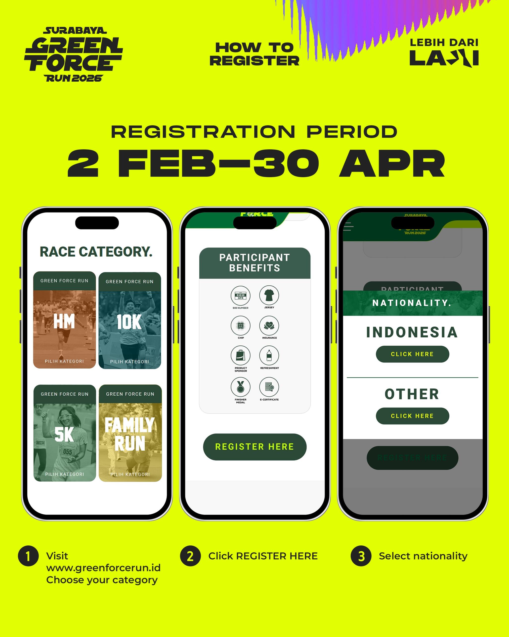 Pendaftaran Surabaya Green Force Run 2026 dibuka pada 2 Februari sampai 30 April 2026. Buat para pelari yang masih kebingungan mendaftar, simak infografis lengkap di bawah ini. Informasi terkait pendaftaran kolektif komunitas bisa langsung menghubungi contact person ini (085385543616)